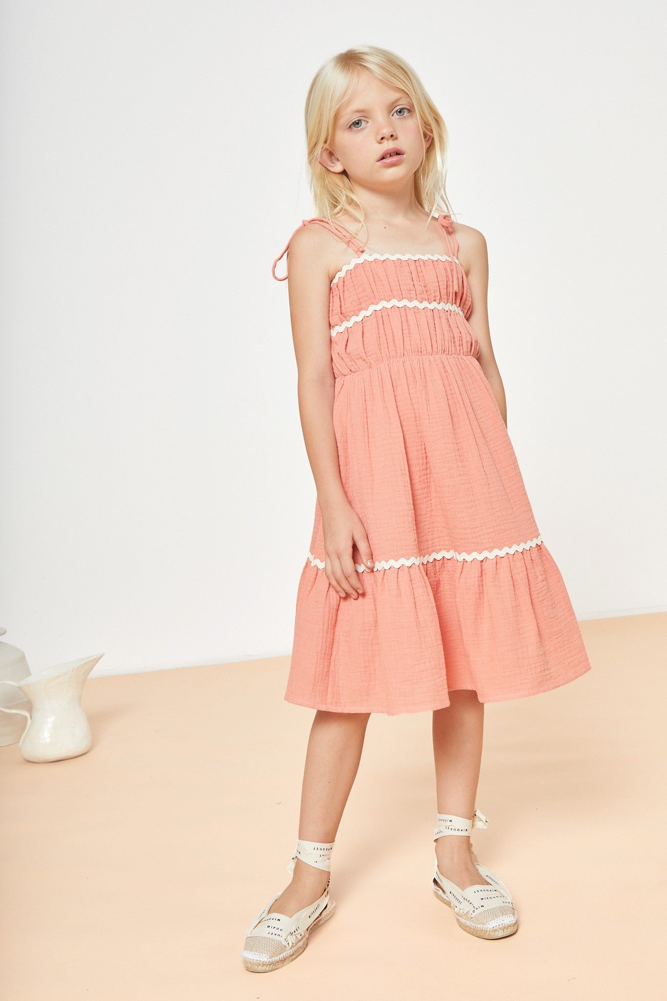 Elegant yet playful, this flared sun dress is defined by a contrasting wavy ribbon trim. Stated in a textured organic muslin, it's lightweight and breathable, making it perfect for warm summer days.